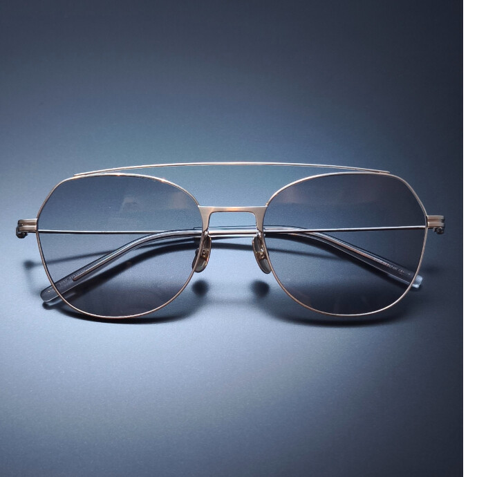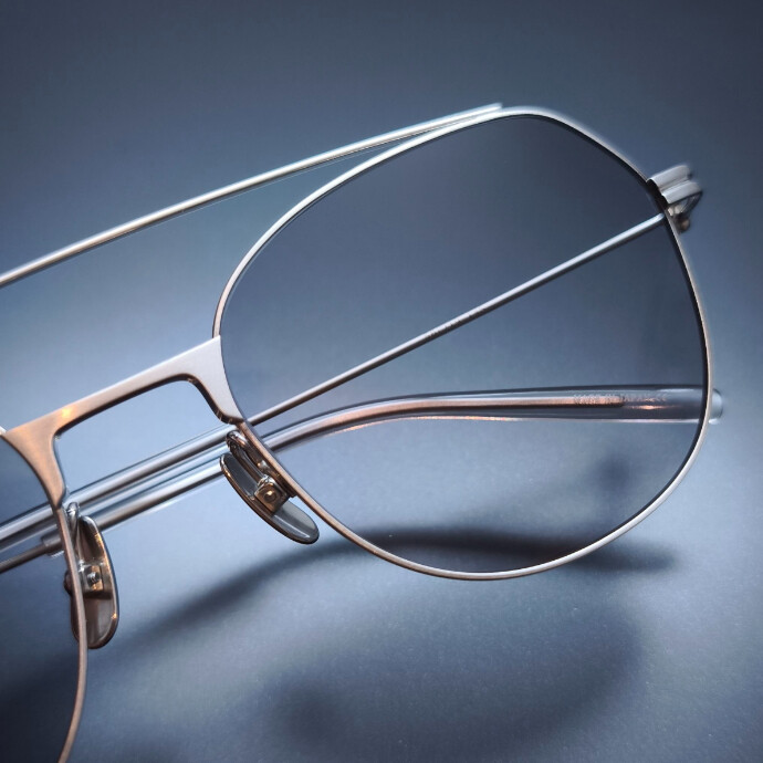 一見癖のあるデザインですが、細身のチタンフレームで表現されており、掛けてみると意外や意外。違和感なく馴染みます。