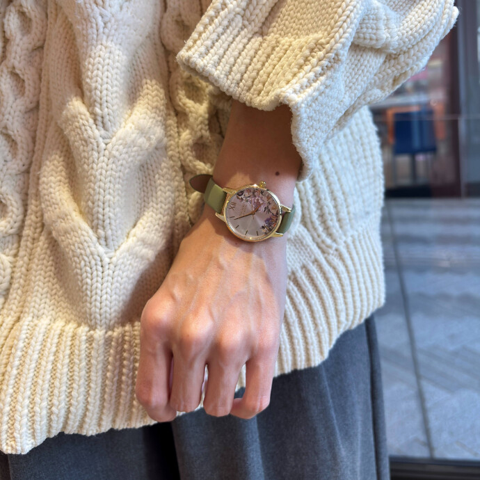 文字盤には繊細なイラストレイテッドフローラルが描かれており、