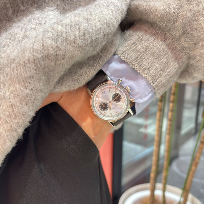 ブレゲ数字インデックスを採用し、ヴィンテージウォッチのクラシカルな雰囲気を演出しています。